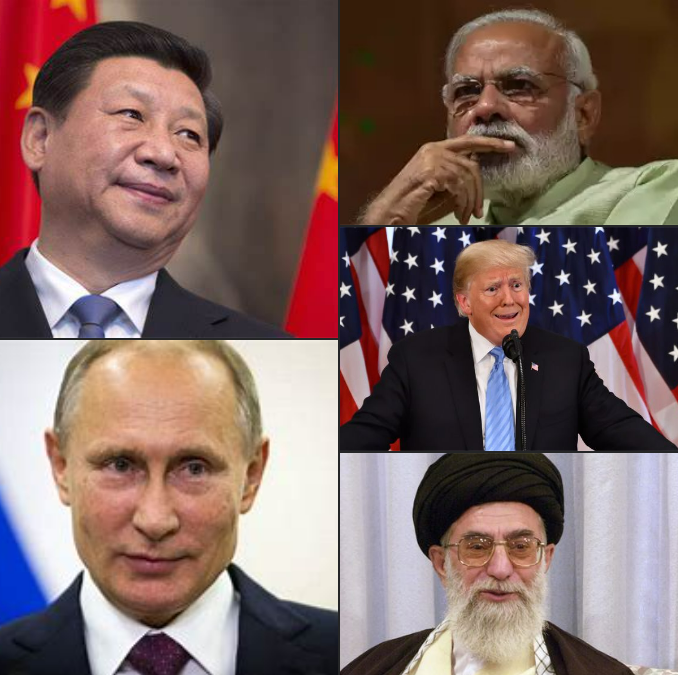 From left to right (Clockwise) Xi Jinping, Narendra Modi, Donald Trump, Ayatollah Ali Khamenei, Vladmir Putin
